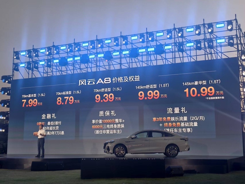在前款車型的對比下,全新風(fēng)云A8也正式上市,新車共推出2種純電續(xù)航共5款車型,售價(jià)7.99-10.99萬元。