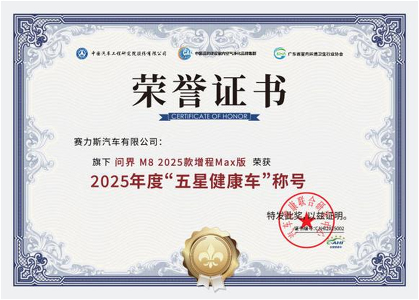 11月28日,中國汽研發(fā)布2025年年度獲得五星健康車全體車型,問界M8憑借在清新空氣、健康防護、綠色出行三大維度的卓越表現(xiàn),斬獲“五星健康車”認證。