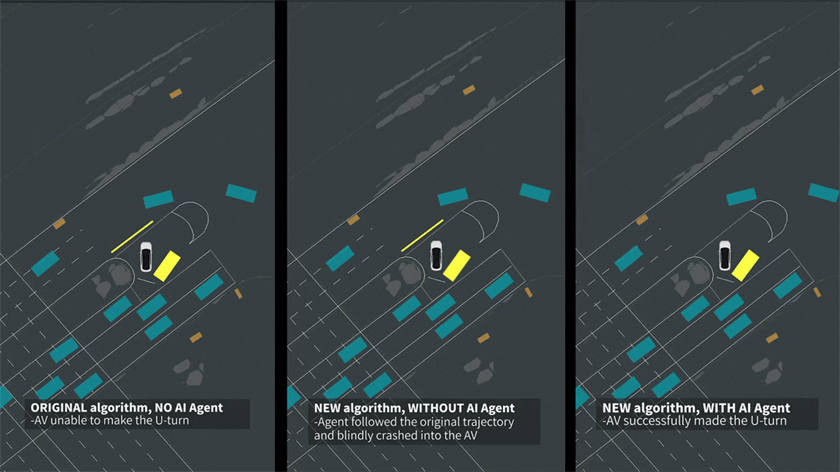 如對比視頻所示,在左側(cè)“原始算法+無AI主體”的組合下,自車表現(xiàn)猶豫,直至對向車輛完全通過后才開始通行,無法滿足效率要求;在中間“新算法+無AI主體”的模擬中,自車僅按預(yù)設(shè)軌跡行駛,缺乏對周邊車輛行為的預(yù)測,最后發(fā)生碰撞,無法滿足安全要求;在最右側(cè)“新算法+AI主體”的加持下,自車能夠?qū)崟r判斷周邊車輛的行駛意圖,在確保安全的前提下流暢通過,實現(xiàn)了效率和安全雙重保障。
