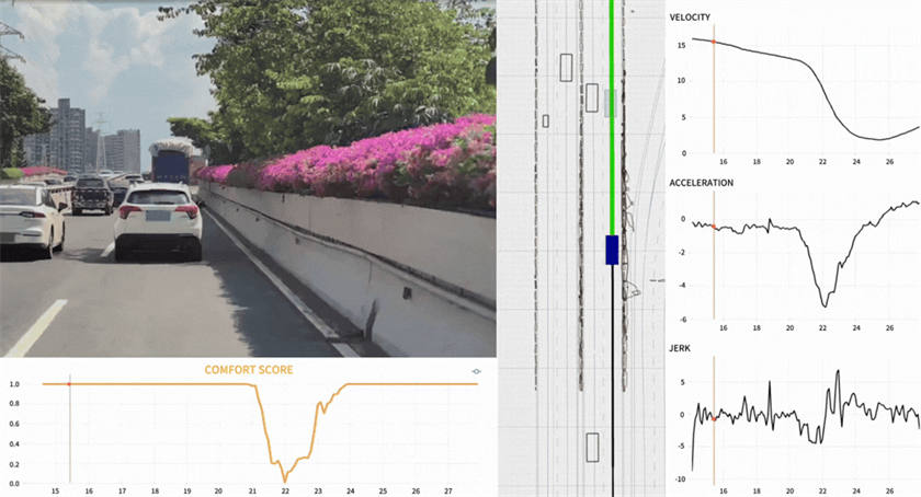 畫面中的舒適度曲線(Comfort Score)是“AI指標”模塊的核心指標之一,動態(tài)量化了行駛過程中的乘客舒適度,為算法評估和迭代提供了實時判斷依據(jù)。畫面均由WeRide GENESIS生成。