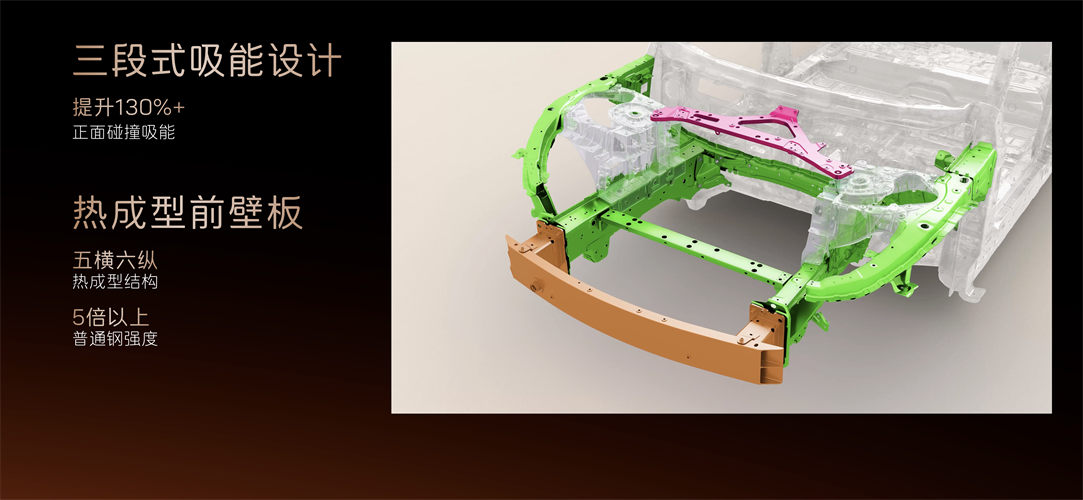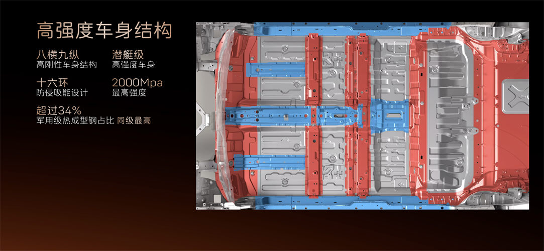電池安全方面,電芯采用寧德時(shí)代AI 加強(qiáng)的第八代智能產(chǎn)線,累計(jì)通過(guò)150+項(xiàng)專項(xiàng)安全和性能試驗(yàn),電池0起火0爆炸,達(dá)到了極高安全標(biāo)準(zhǔn)。此外,門檻梁采用全貫穿式六宮格鋁型材和熱成型鋼三層外中內(nèi)板組合設(shè)計(jì),形成“三明治”式防護(hù)結(jié)構(gòu),外加熱成型雙拼座椅后橫梁結(jié)構(gòu),組成三重防護(hù)結(jié)構(gòu),在遭遇沖擊時(shí)高效保護(hù)電池。