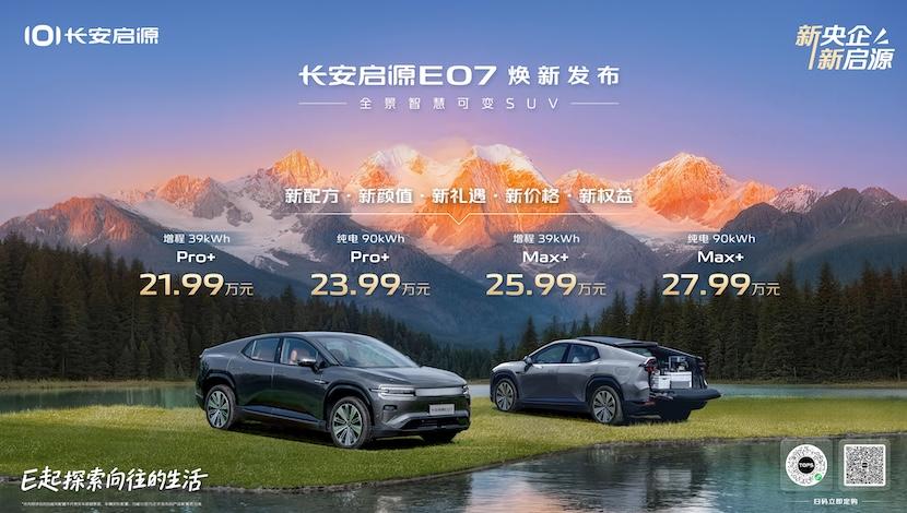 2025年8月29日,長(zhǎng)安啟源E07在2025成都國(guó)際汽車展覽會(huì)煥新上市,此次發(fā)布純電、增程兩種動(dòng)力,四款車型,售價(jià)21.99萬(wàn)元起。