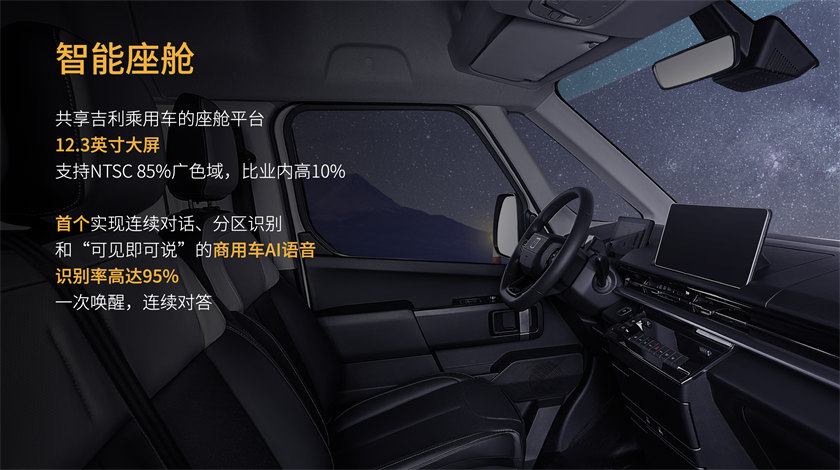 據(jù)介紹,智能化是定義電動(dòng)大VAN的核心標(biāo)準(zhǔn),遠(yuǎn)程超級(jí)VAN充分共享吉利在電子電氣架構(gòu)方面的優(yōu)勢(shì)積累,在智能座艙、智能駕駛、智能貨艙三方面都有著出色的表現(xiàn)。新車配備了12.3英寸中控大屏,擁有首個(gè)實(shí)現(xiàn)連續(xù)對(duì)話、分區(qū)識(shí)別和“可見(jiàn)即可說(shuō)”的商用車AI語(yǔ)音。