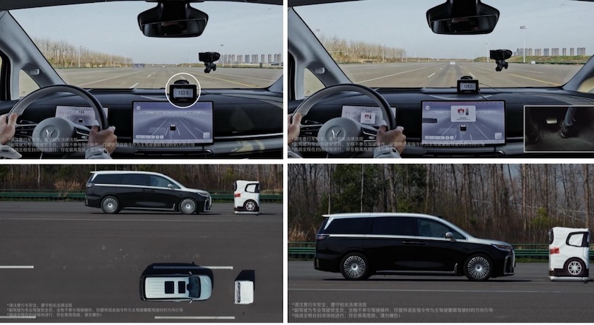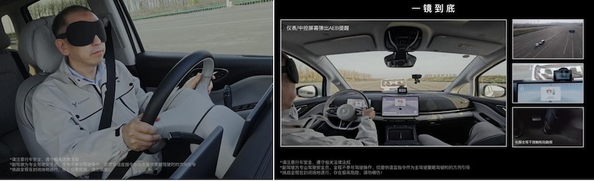 挑戰(zhàn)在封閉場地中進(jìn)行,頭戴眼罩的盧放坐入車內(nèi)后啟動車輛智駕系統(tǒng),同時(shí)深踩油門拉動車速快速飆升至130km/h向障礙物沖刺,在距離障礙物不到一米時(shí)車輛實(shí)現(xiàn)自動剎停。這既刷新了行業(yè)中的AEB挑戰(zhàn)紀(jì)錄,也首次以車企CEO沖鋒一線的親測體驗(yàn)。
